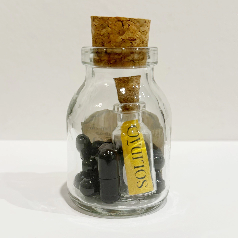 Um (01) vidro pequeno com o "veneno" solidão, que é colocado dentro do vidro maior.
